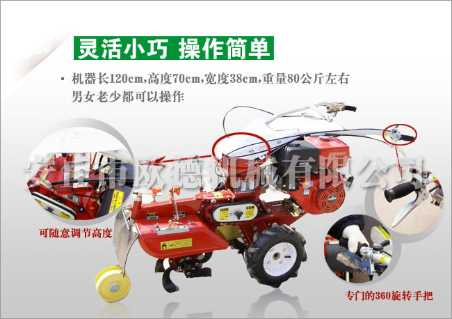 11、適用性強(qiáng):適用各種山地,丘陵、平原、旱田、水田、大棚、果園、及狹窄地作業(yè),省心。