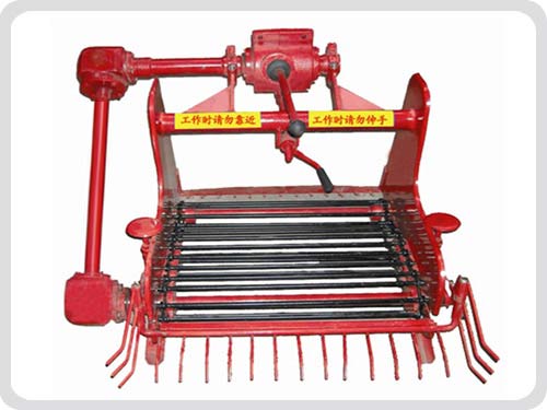 此薯類土豆收獲機是與手扶拖拉機相配套,一側(cè)力輸出(8-11馬力)拖拉機為動力,采用齒輪傳動,薯塊由輸送鏈輸送到機器尾部的震動側(cè)篩上,經(jīng)過篩動后滑落到機器前進方向的后側(cè)地面上以便收集。